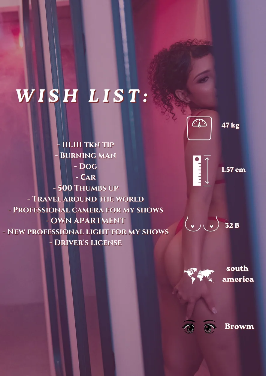 Gaya Anjing, Tampar Punggung, Tarian Erotik, Menunjukkan Lurah Faraj, Penilaian Zakar, Main jari, Tarian Bogel, Alat Permainan Seks, Kulum, Urut, Melancap, Separuh Bogel, Pancutan Mani, Dildo atau Penggetar, Hisap Sedalam Mungkin, Arahan Lancap, Orgasma, Tumit tinggi, Gaya Berkuda, Pertunjukan Minyak